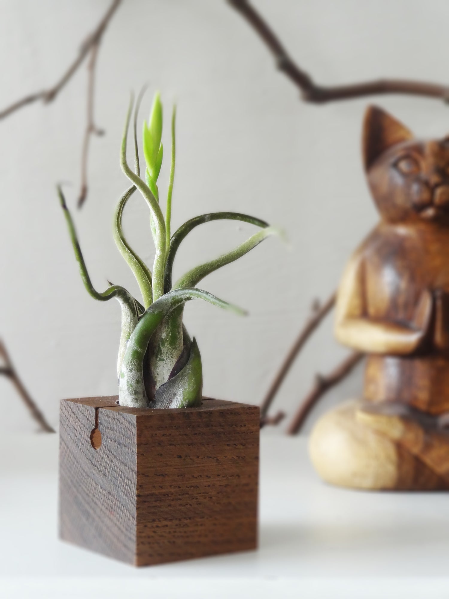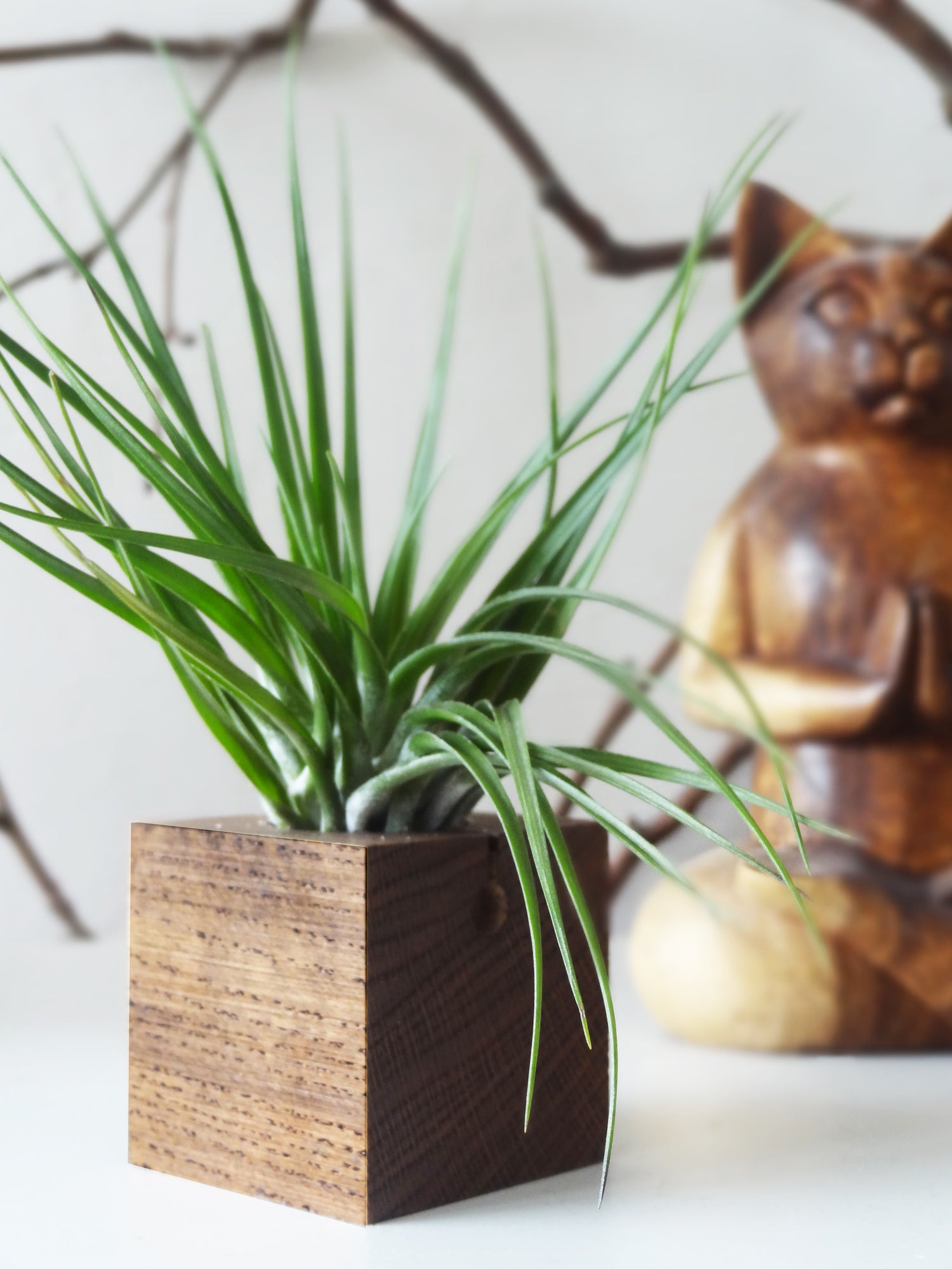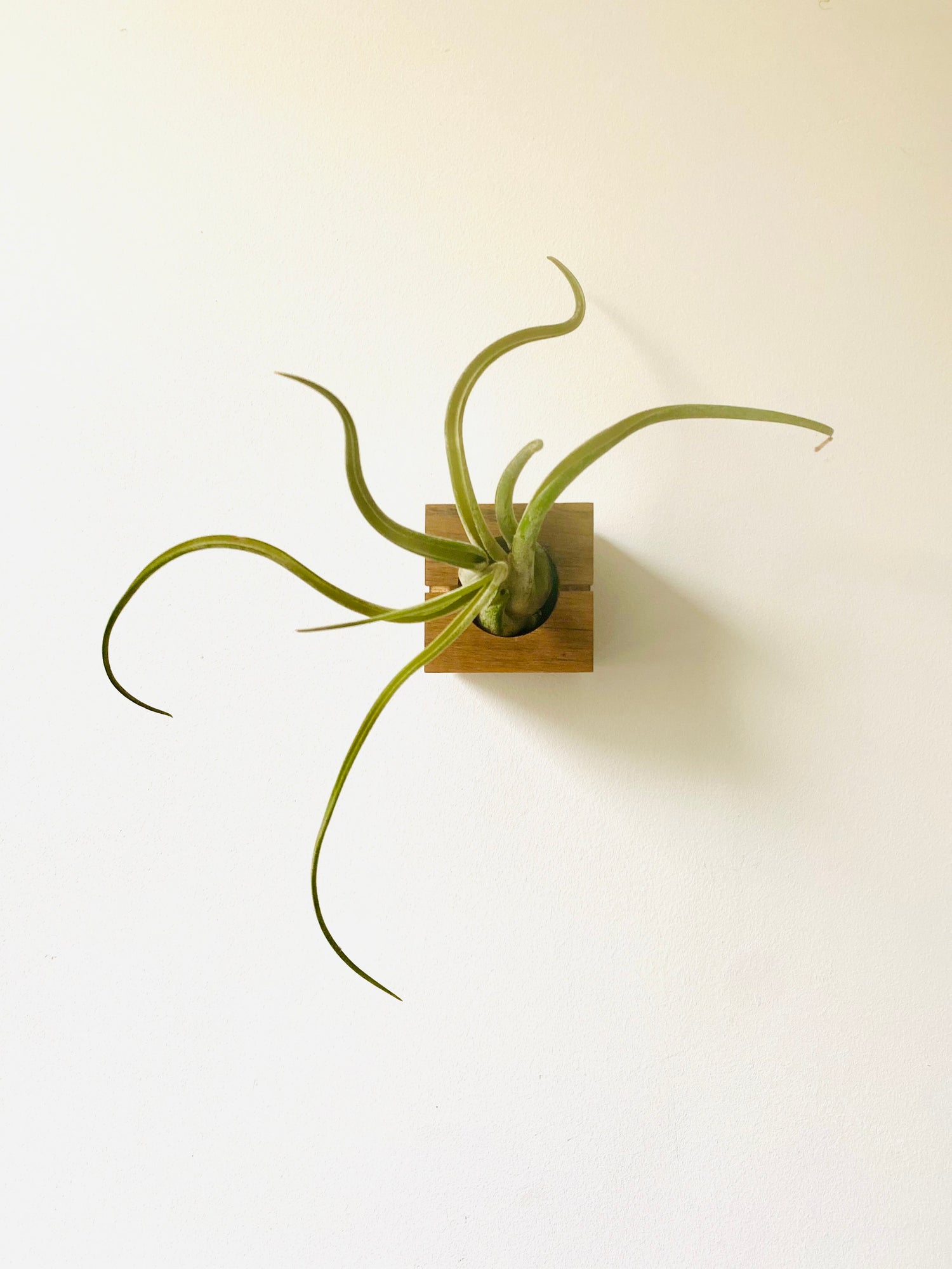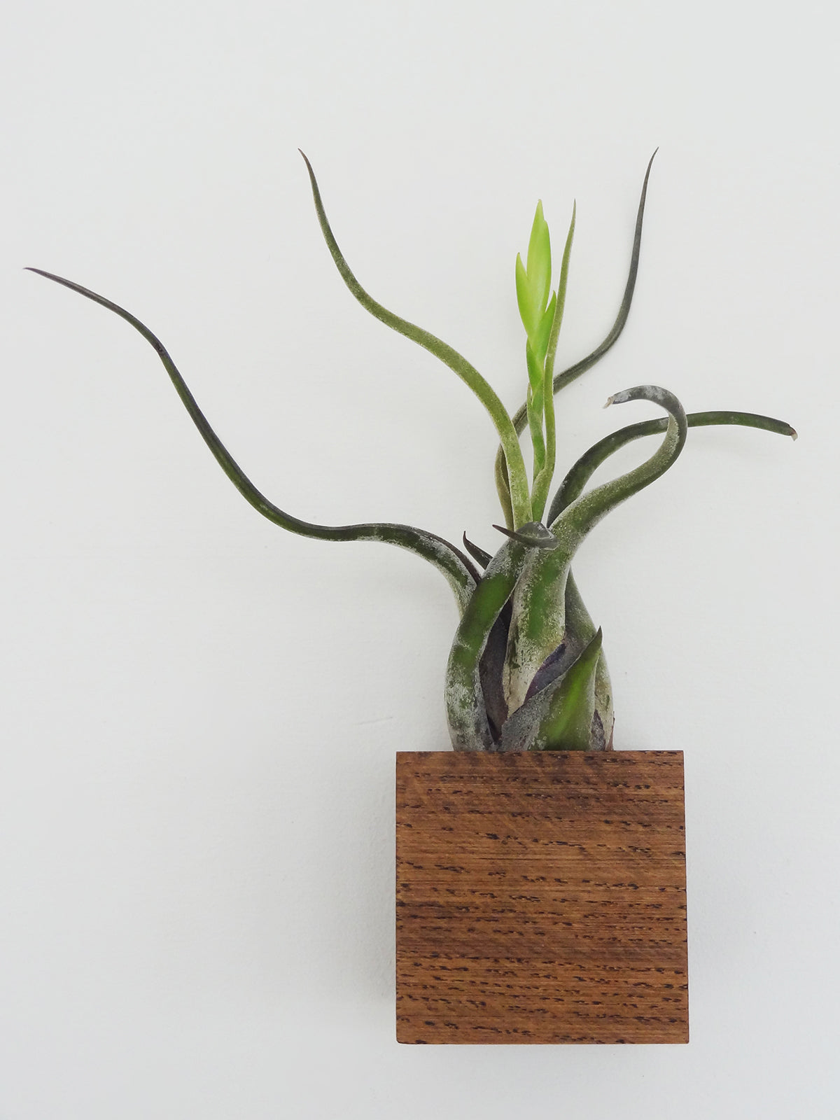 Conseil d’entretien : Pour préserver l’apparence du bois et éviter les taches d’eau, nous recommandons de vaporiser vos plantes aériennes loin des cubes en bois.